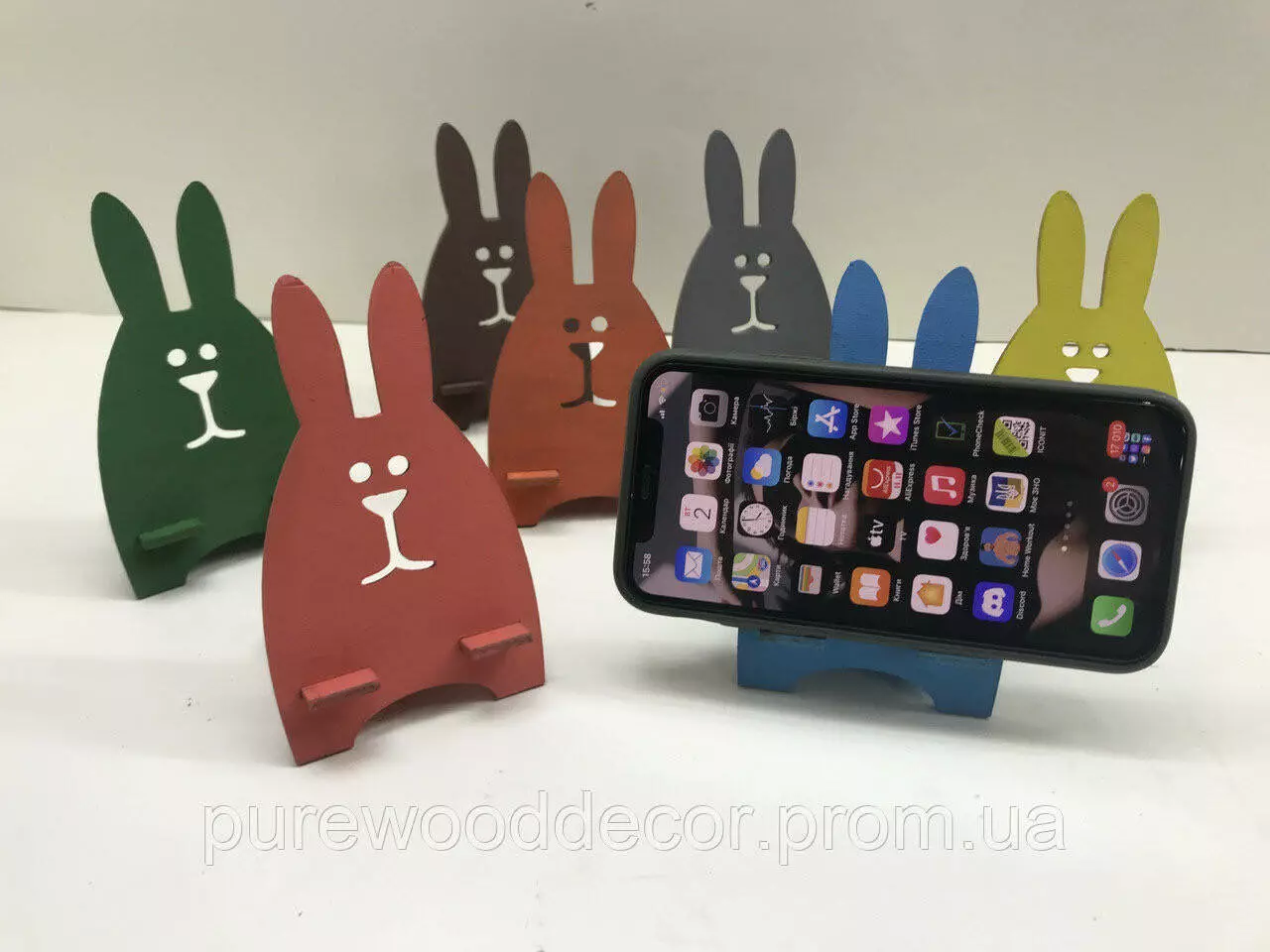 Деревянная подставка для телефона состоит из двух частей, которые легко складываются и разлагаются. то удобная вещь, которую можно использовать где угодно, дома, на работе, в поезде и т. д. На ушках фигурок можно наматывать наушники.