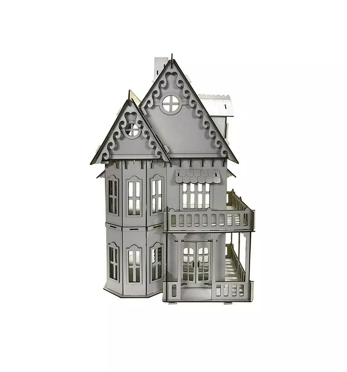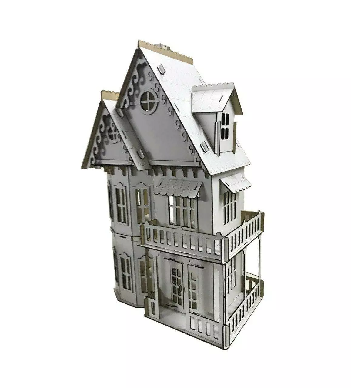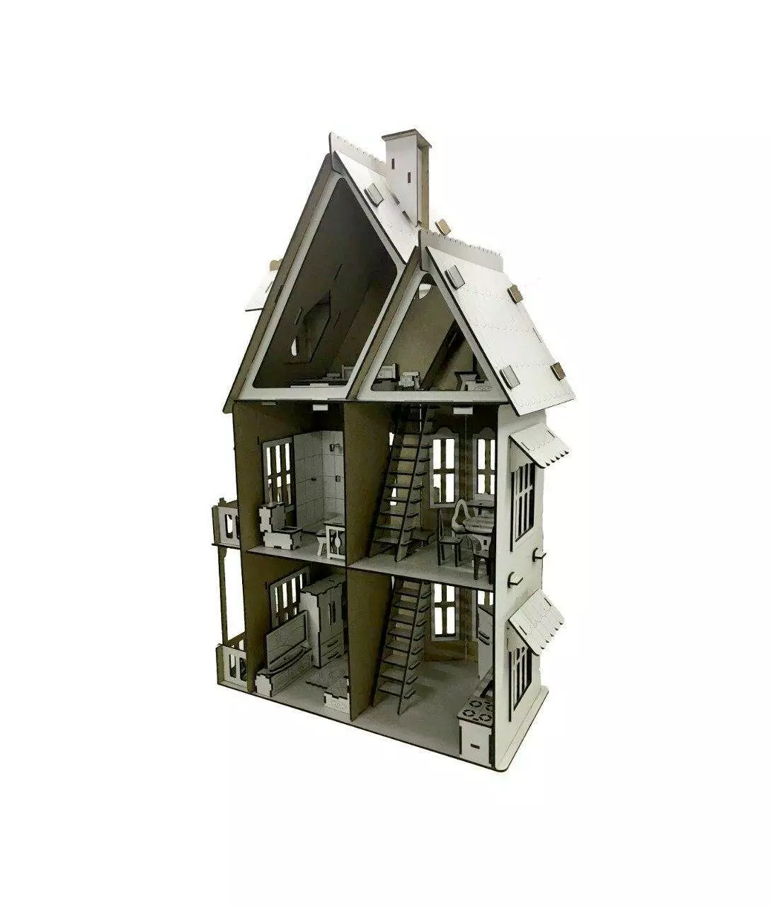 Кукольный домик из ХДФ имеет три этажа, две террасы и чердак. В комплект поставки будет входить кукольная мебель, которую можно передвигать и украсить по своему вкусу.