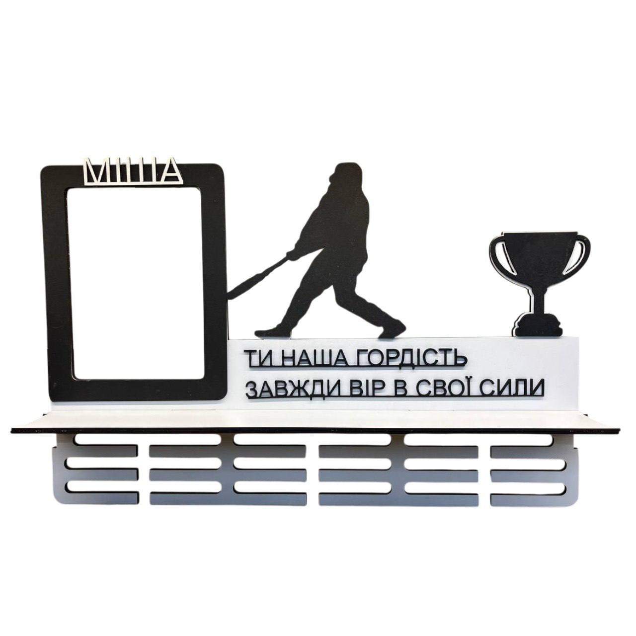 Вешалка для медалей бейсбол имена с полкой и подсветкой 59х39 см Бело-черная
