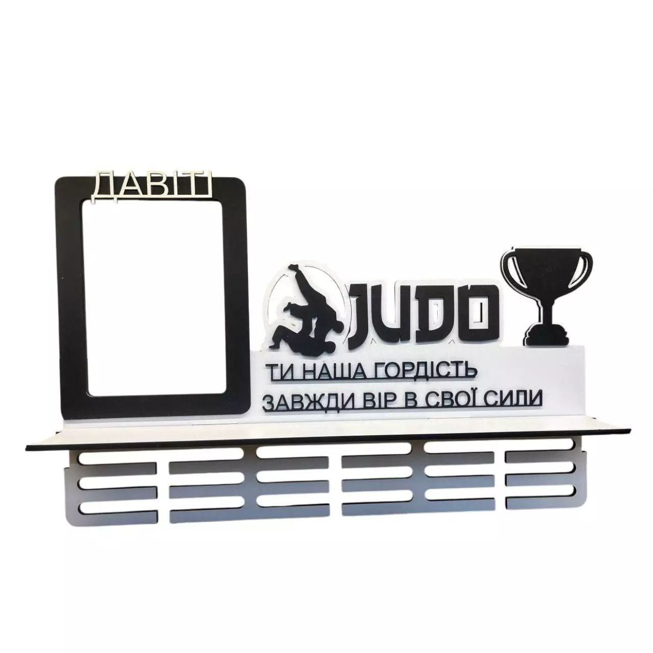 Вешалка для медалей Дзюдо имена с подсветкой и полкой 59х39 см Бело-черная