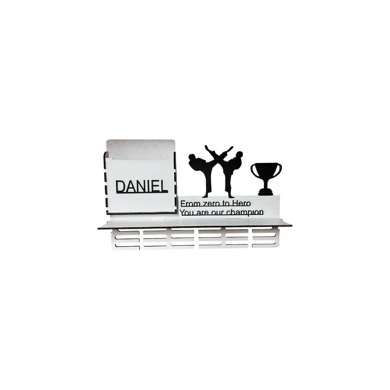 Вешалка для медалей карате имена с полкой и подсветкой 59х39 см Бело-чёрная