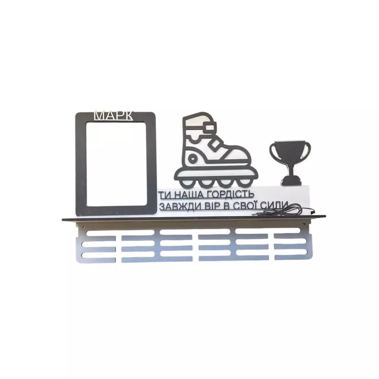 Вешалка для медалей катание на роликах имена с полкой и подсветкой 59х39 см Бело-чёрная