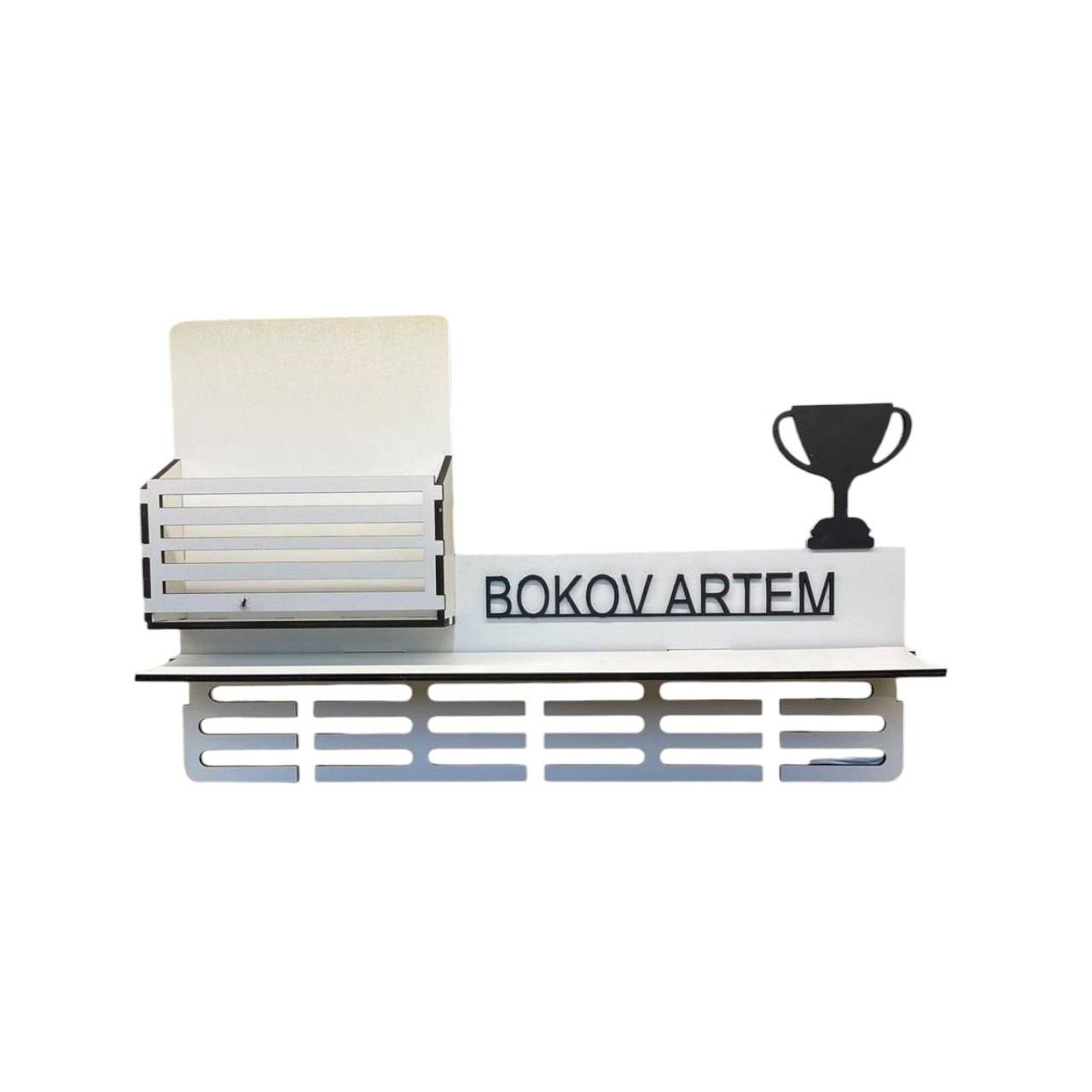 Вешалка для медалей универсальная имена с полкой и подсветкой 59х39 см Бело-черная