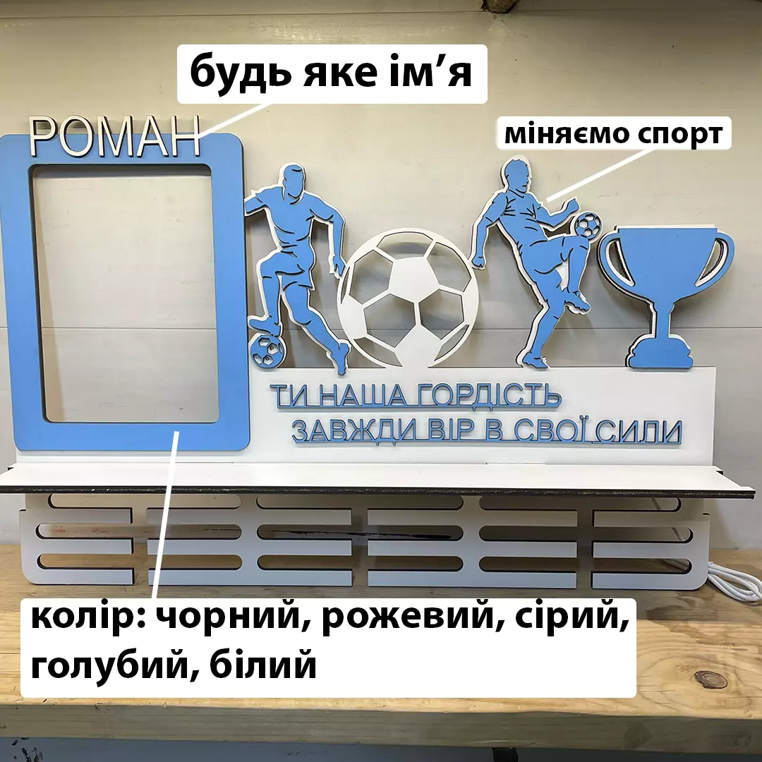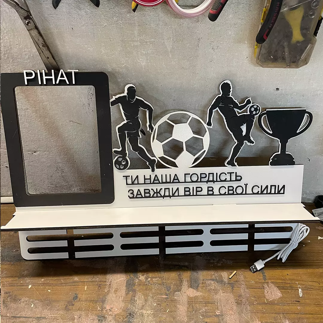 Вешалка для медалей WoodCraft Футбол с полкой и подсветкой 59х39 см Белая