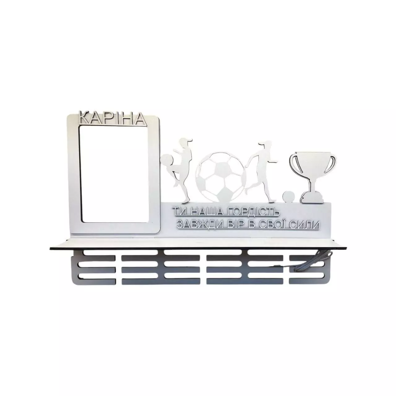 Вешалка для медалей женский футбол имена с полкой и подсветкой 59х39 см Бело-чёрная